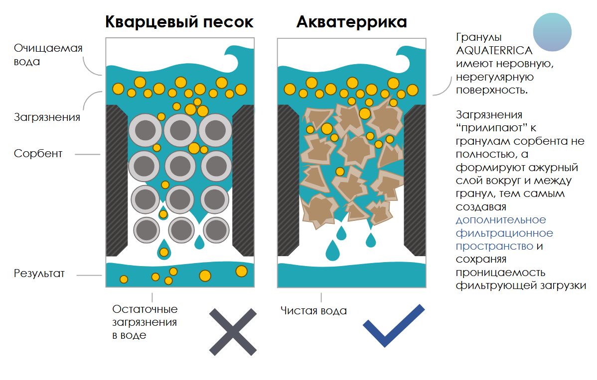 При фильтрации загрязнённых вод на минеральном сорбционно-фильтрующем материале АКВАТЕРРИКА D происходит несколько процессов одновременно: